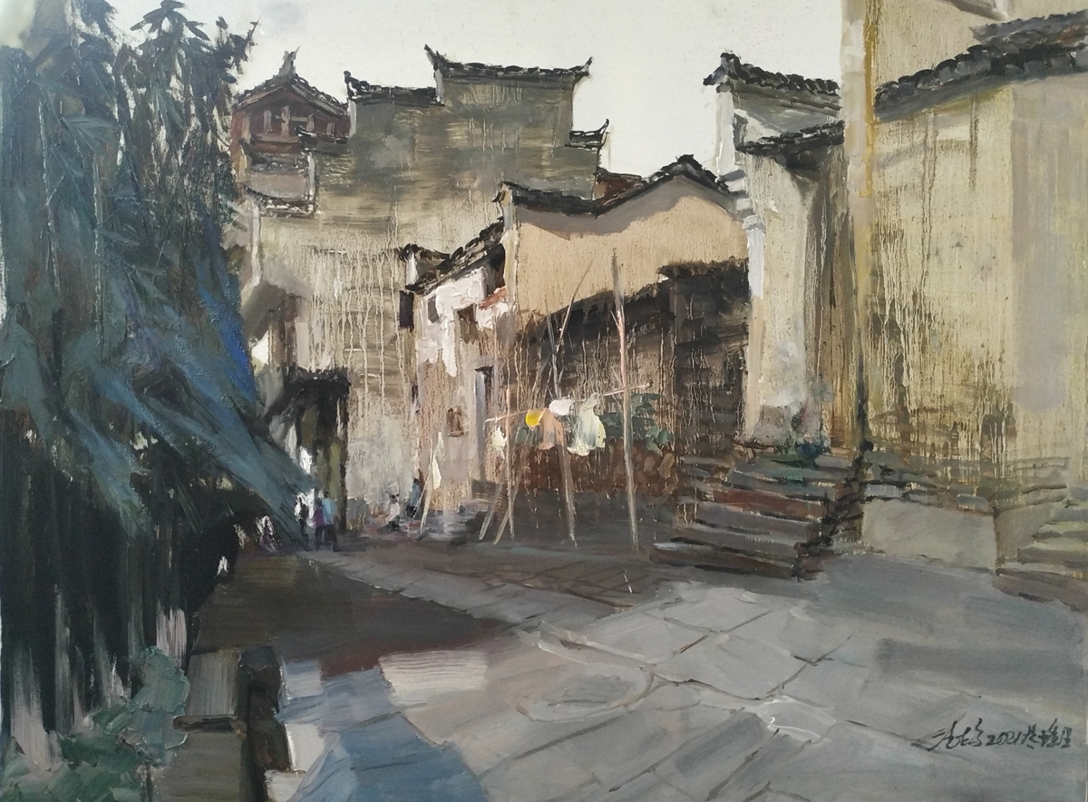 不知不觉,已是初春。曾经的耕耘和汗水,尘封的纷繁往事,随春风吹起,让我们一起随油画艺术家汪志高先生回望深秋里的婺源。沿村间小道前行,在画作中欣赏西冲村的斑驳陆离与五彩斑斓,踏上青石小道,通幽曲径,道旁古色古香、在花间云雾中的古老民居、白墙灰瓦,写满了历史斑驳的印迹;一缕暖阳照拂衣衫,与田间枝头上啾啾鸟鸣、碧浪清波处鸭鹅嬉戏,和曲而歌;再看那些曾经昂扬的枝叶,在淅沥秋雨中由青涩变为金黄,秋风飘过,一地落叶缠绵,深秋的浓墨重彩在光影中斑驳。