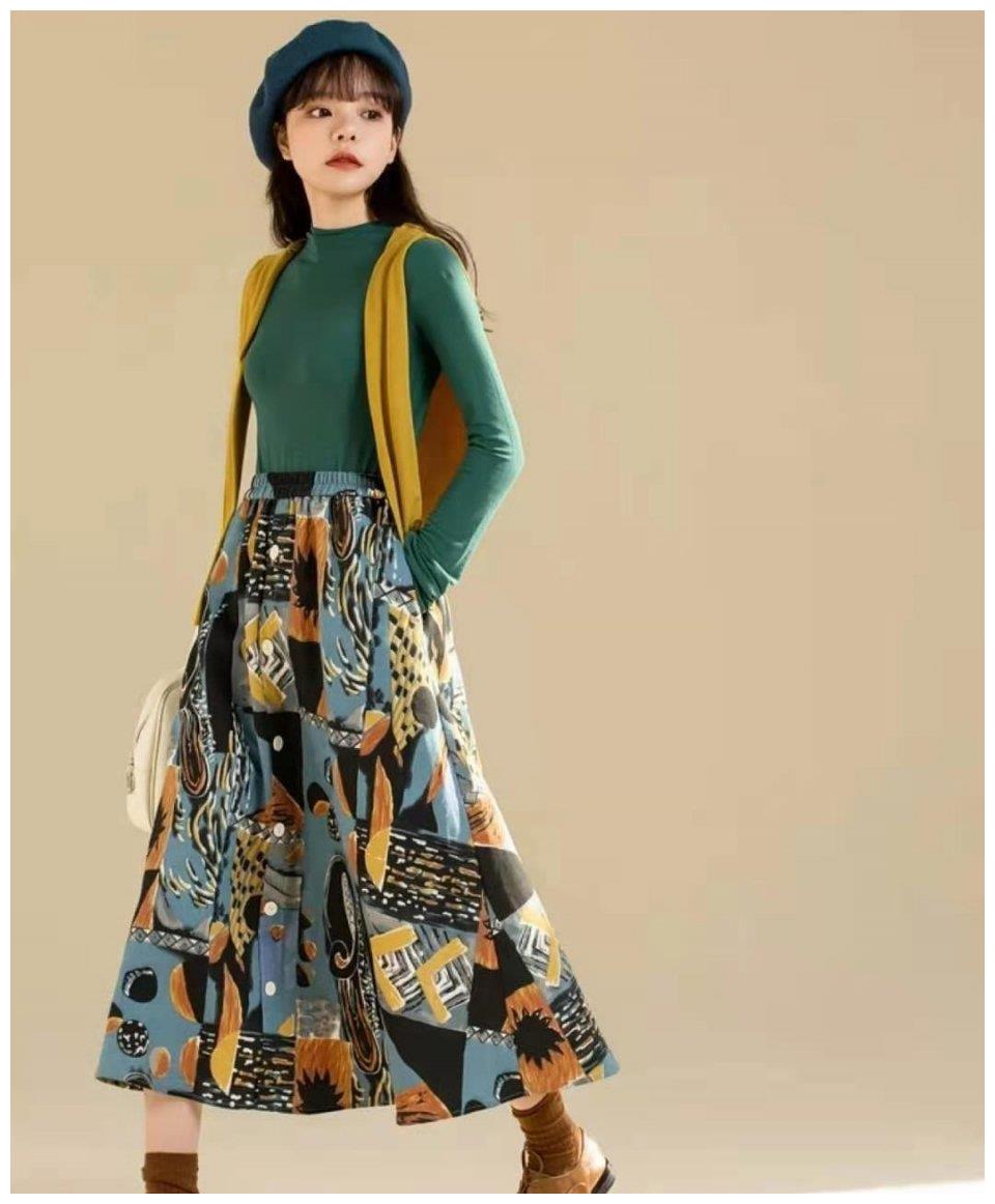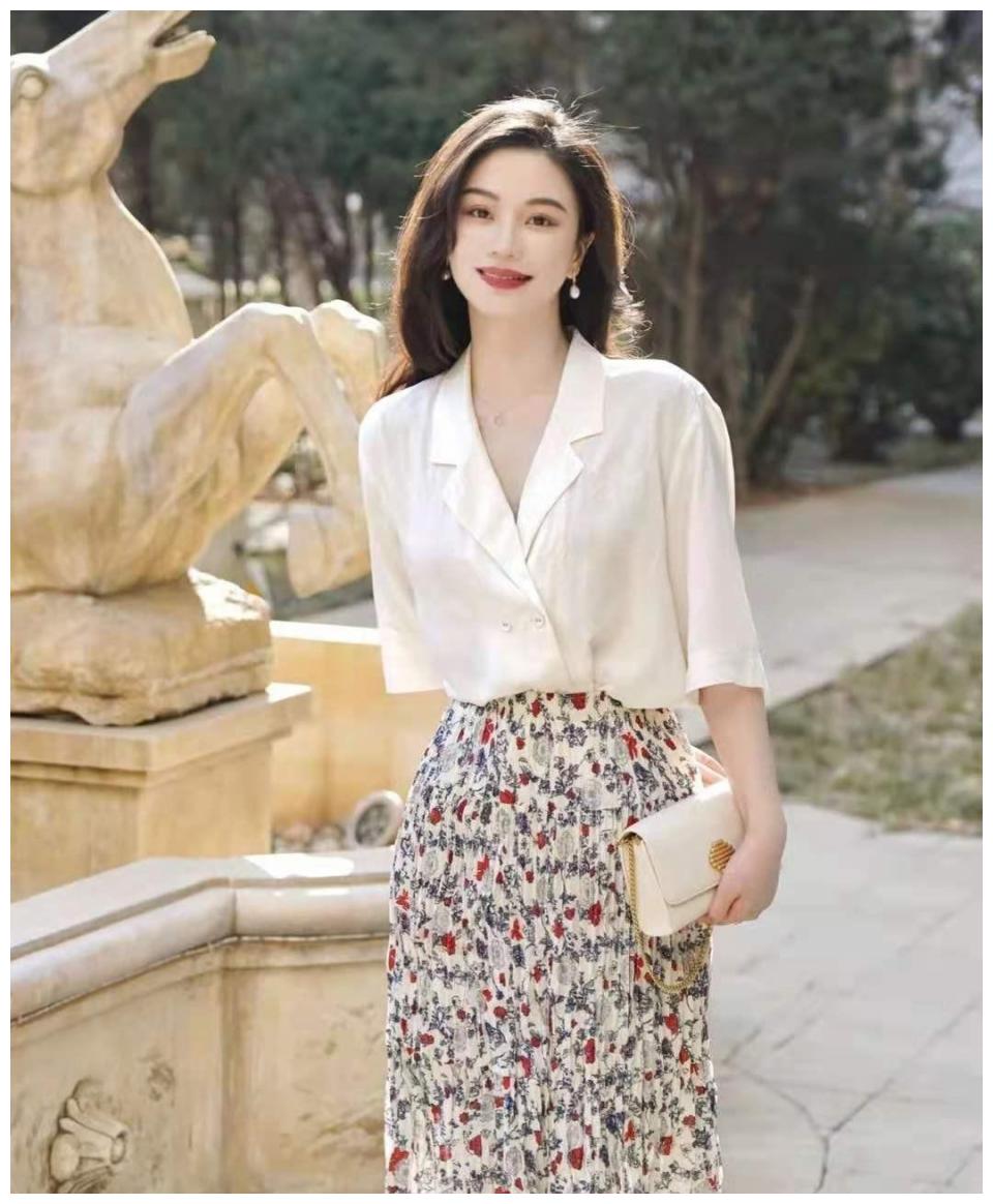 半身款的油画裙更具有搭配空间,上身配一件简约的半袖或是七分袖,凉爽轻快,经典的上简下繁穿搭很好得综合了油画裙的繁复与优雅,使得穿搭更加气质知性。但一定要选择露出脚踝的款式,更显腿部轻盈,骨架娇小的女人选择较为修身的油画裙更能展现女性的魅力。