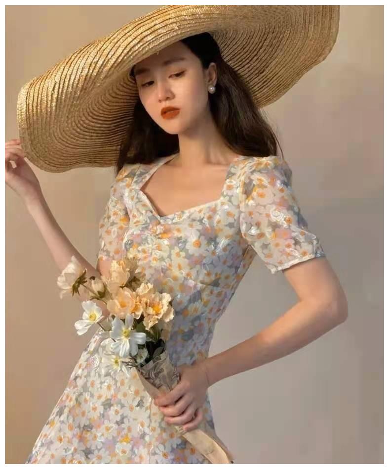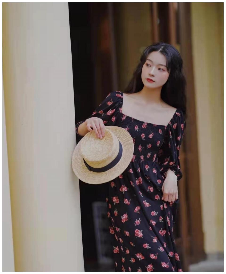 方领设计的油画裙更加知性气质,领口较宽,露出大片的锁骨显得性感迷人,方领有很好的修饰颈部线条的效果,非常适合圆脸女性。