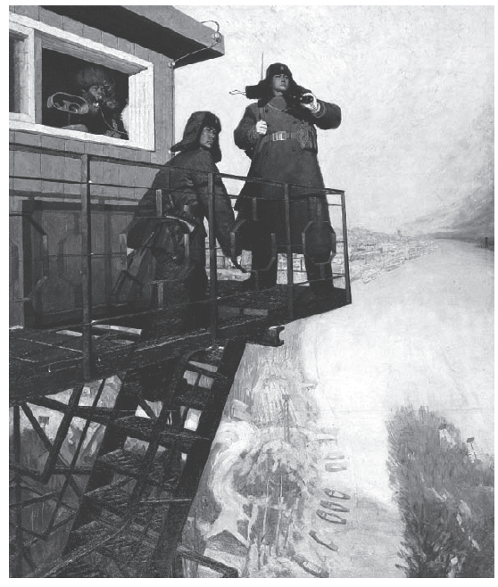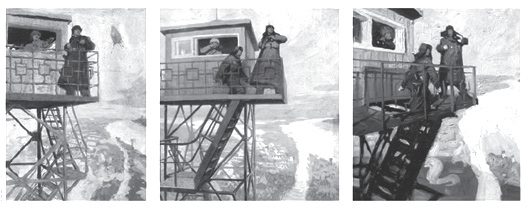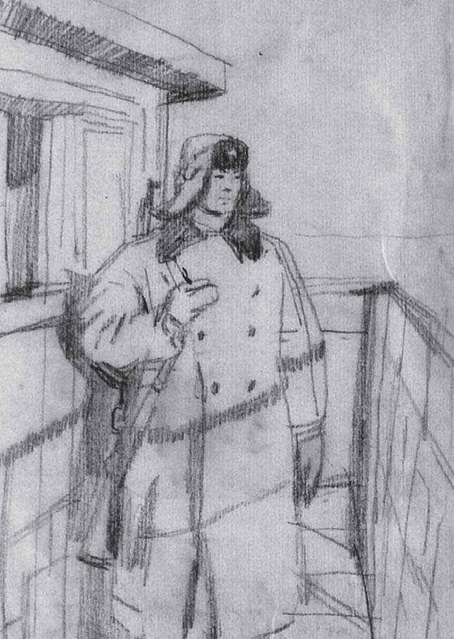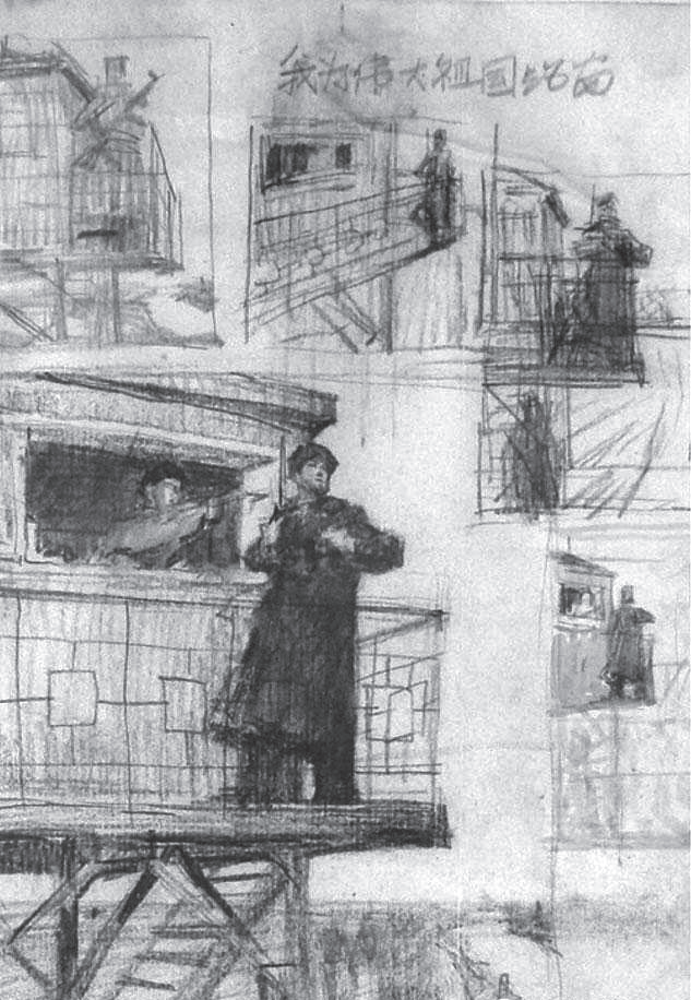 在北大荒时期创作多幅油画作品,尤其是1974年以油画《为我们伟大祖国站岗》参加全国美展而著名。对于这幅作品,沈嘉蔚对画面的每一细节都非常注意观察与记录,从枪支型号到铁塔结构,包括栏杆和螺丝,(图3-10)为了记录细节曾冒着零下三十几度的严寒,几小时停留在铁架上仔细观察,并站在铁塔梯架上画速写。他曾说:“实际上我在画的过程中间始终在画外光写生,我画什么都是外光写生,而且我专门在早晨太阳没出来之前爬到屋顶上去,看太阳第一束光照到人脸上的这种颜色,还有观察黎明和晚上有什么不一样的,雪地的反光什么的。这都是画了很多很多写生之后,发现那个白炽灯泡和日光灯的光线可以构成一个像太阳一样的感觉,我都画了写生。这张画是我有生以来,空前绝后地画了很多很多习作的一张画,这张画真正创作的时候,其实我对一个在早晨的阳光下面的雪地的颜色已经都在脑子里面了,因此,就画得比较深入,比较有变化。”