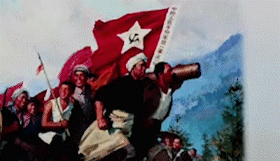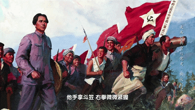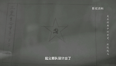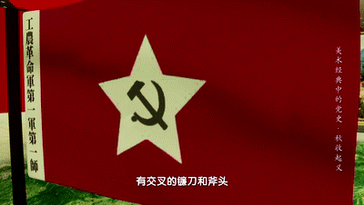 在毛泽东前方,一面军旗迎风飘扬,镰刀、斧头和五角星的符号标志着党领导的工农革命军建立起来了。