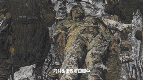 左上方手持军刀的是一名侵华日军头目,他侧着身对着烈士,边走边低下头,这一细节也呼应了历史事实。