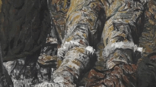 画作没有刻意描绘英雄的外貌,但画家用粗犷而犀利的笔法,勾勒出杨靖宇将军残破的军服,露出许多雪白的棉花,营造了悲壮的现实氛围。