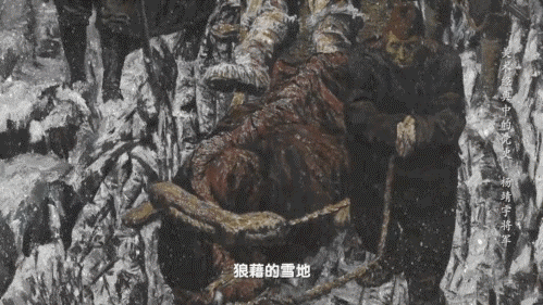 画面前景的农民手牵黄牛,在雪地中艰难前行,他的眼中充满着对烈士杨靖宇的悲悯,双手似是在为英雄虔诚祈祷。