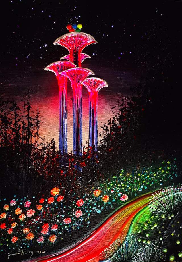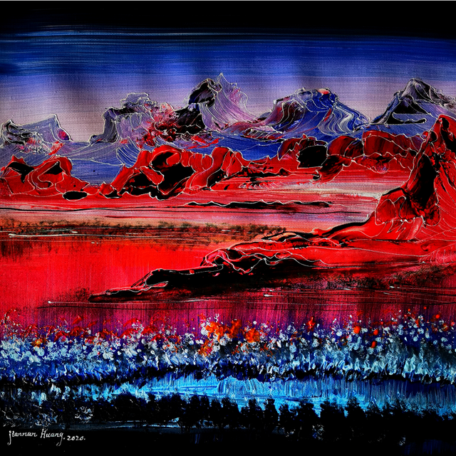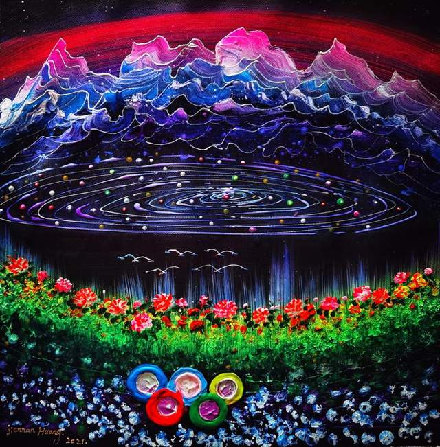 《光辉历程》(下图)用浓烈的色彩构画了梦幻般的童话世界。火一样的远山近岭,预示着全世界人民的热情。次第热烈盛开的奥运之花,象征着体育健儿永攀高峰的伟大精神。“艺术与奥运融合,用中国艺术支持中国冬奥,传播奥运精神,弘扬中国文化,为奥运喝彩。我以火热的情怀、热烈的笔触、丰富的色彩美学倾情创作,以响应现代奥运之父顾拜旦所倡导为人类而运动之关爱人类福祉,共创世界和平的理想实践。”黄建南表示。