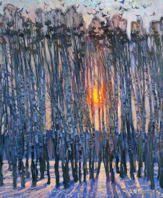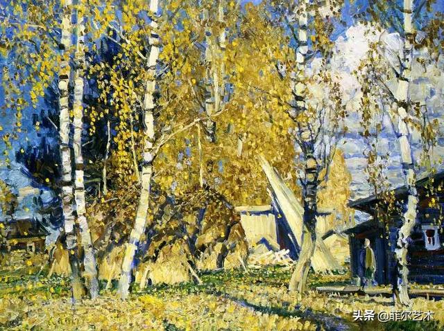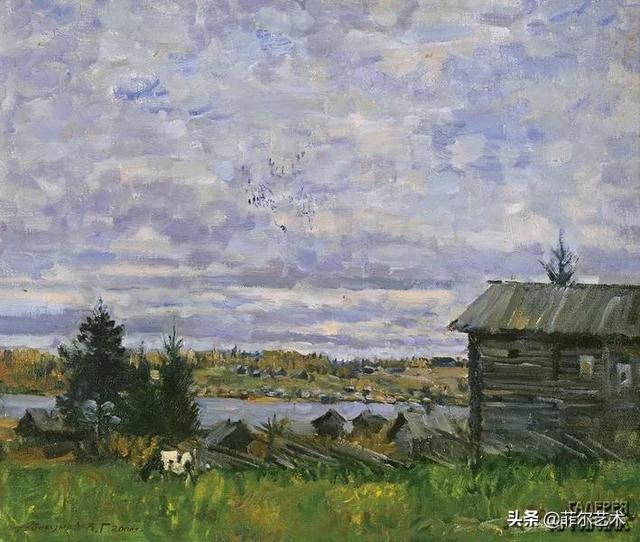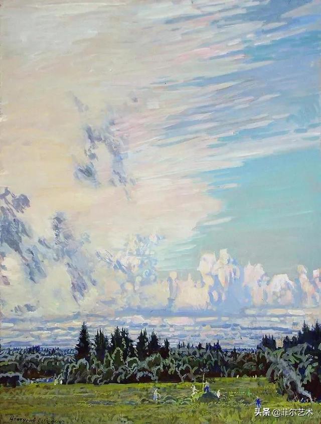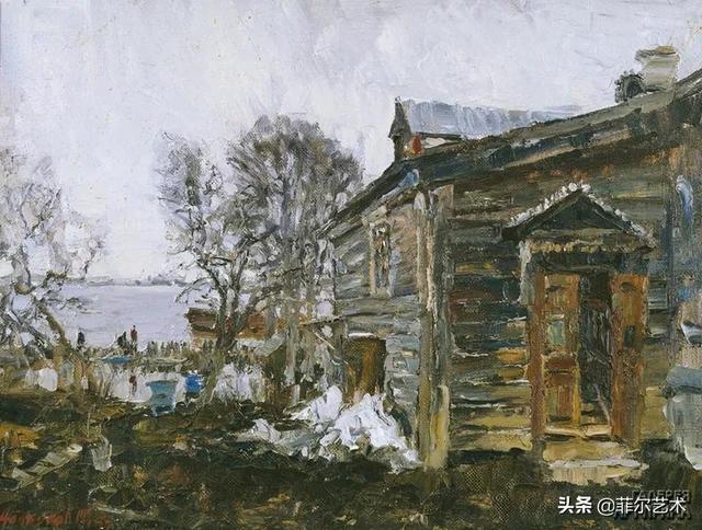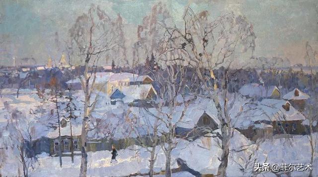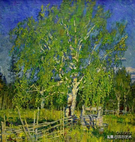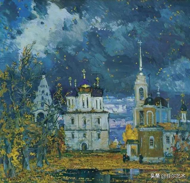 大气的自然世界在阿巴库莫夫的艺术中是至高无上的——在他描绘的宁静、温暖的夜晚中,树林装饰着夕阳的最后一缕光芒,闪闪发光的雪,被雨水洗浴净化的绿色世界,透过春天的青翠看到的修道院白色墙壁……所有这些都是刻意地充满了微妙的,颤抖的诗意。