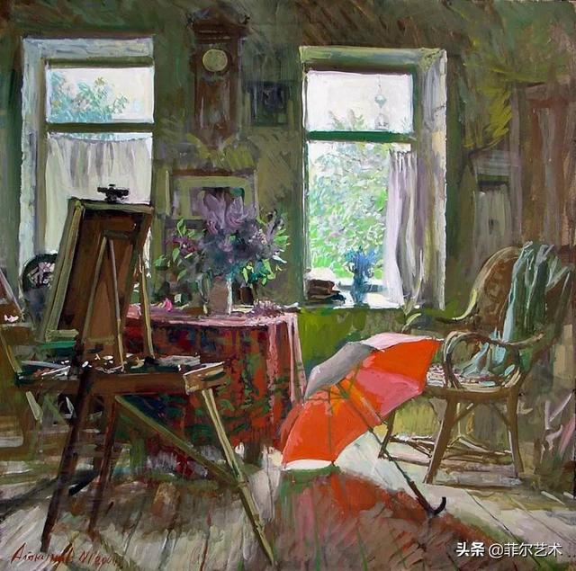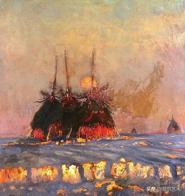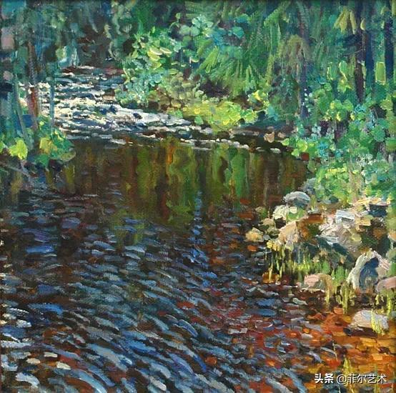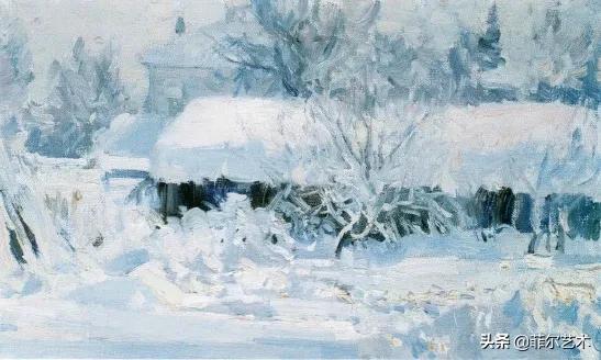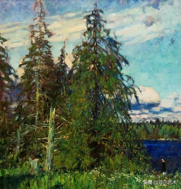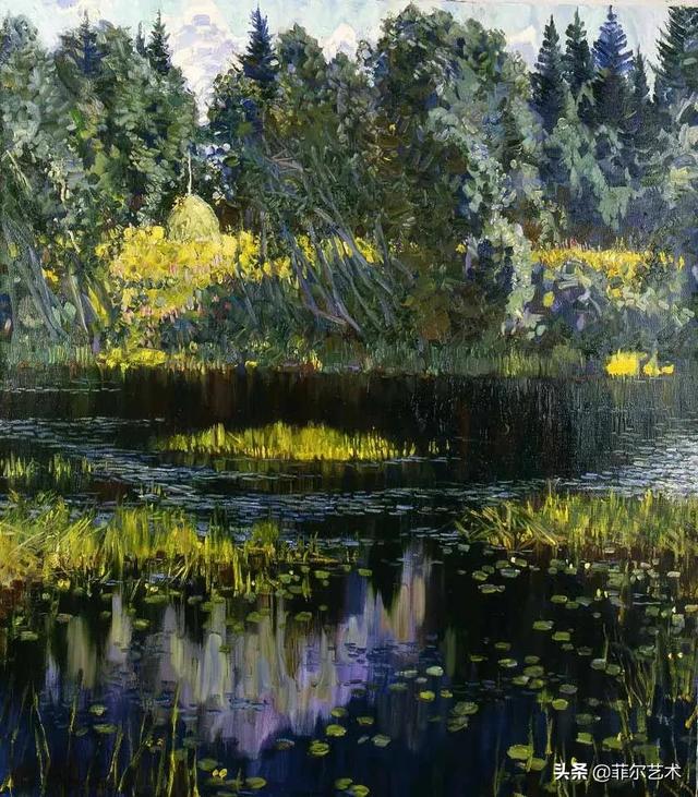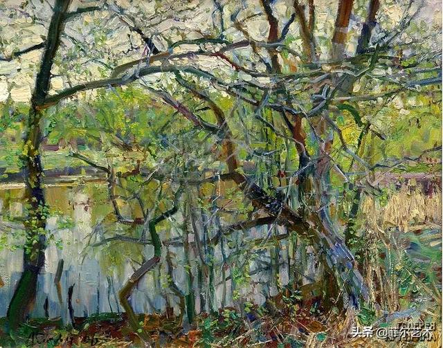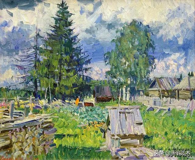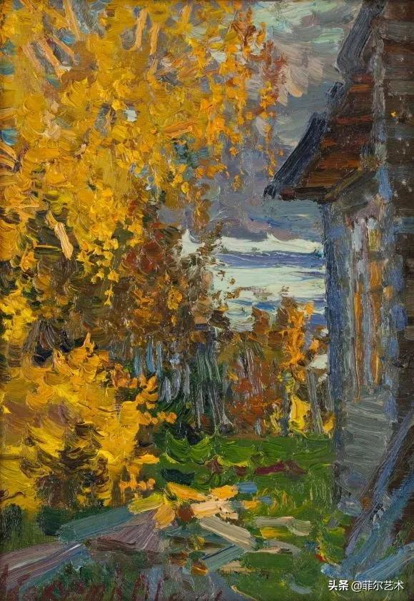 大气的自然世界在阿巴库莫夫的艺术中是至高无上的——在他描绘的宁静、温暖的夜晚中,树林装饰着夕阳的最后一缕光芒,闪闪发光的雪,被雨水洗浴净化的绿色世界,透过春天的青翠看到的修道院白色墙壁……所有这些都是刻意地充满了微妙的,颤抖的诗意。