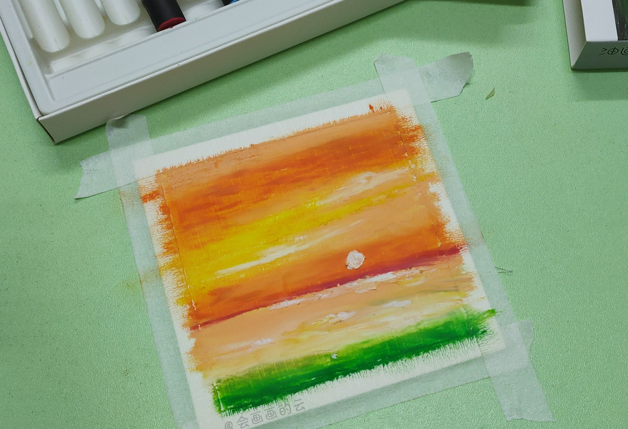007、最后在绿色草地上用橙色、红色、白色点出颜色各样的点,当做远处的小花,整体就画好啦,是不是超级简单,不管有没有画画基础都可以画的,然后把胶带撕掉就完成啦。