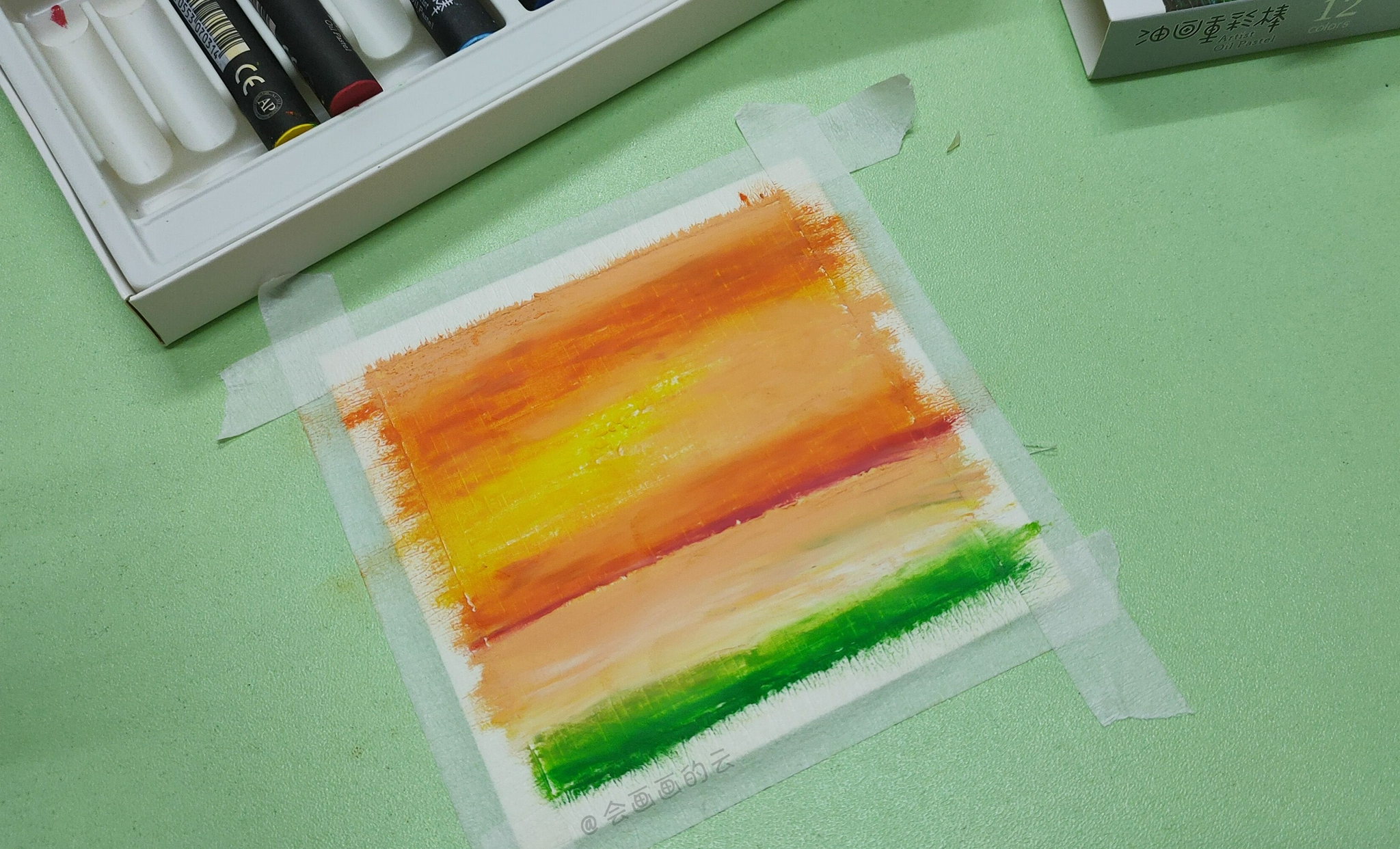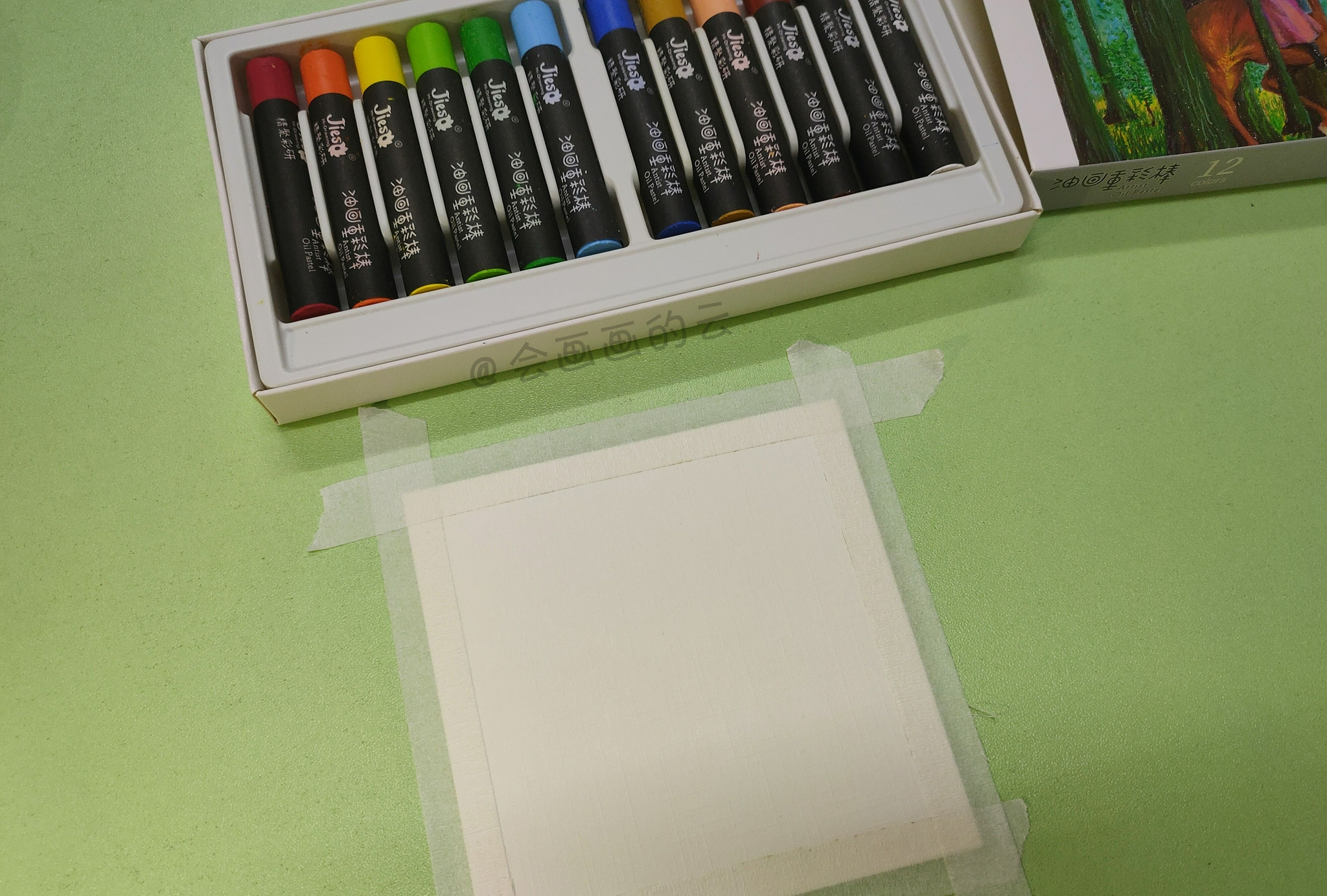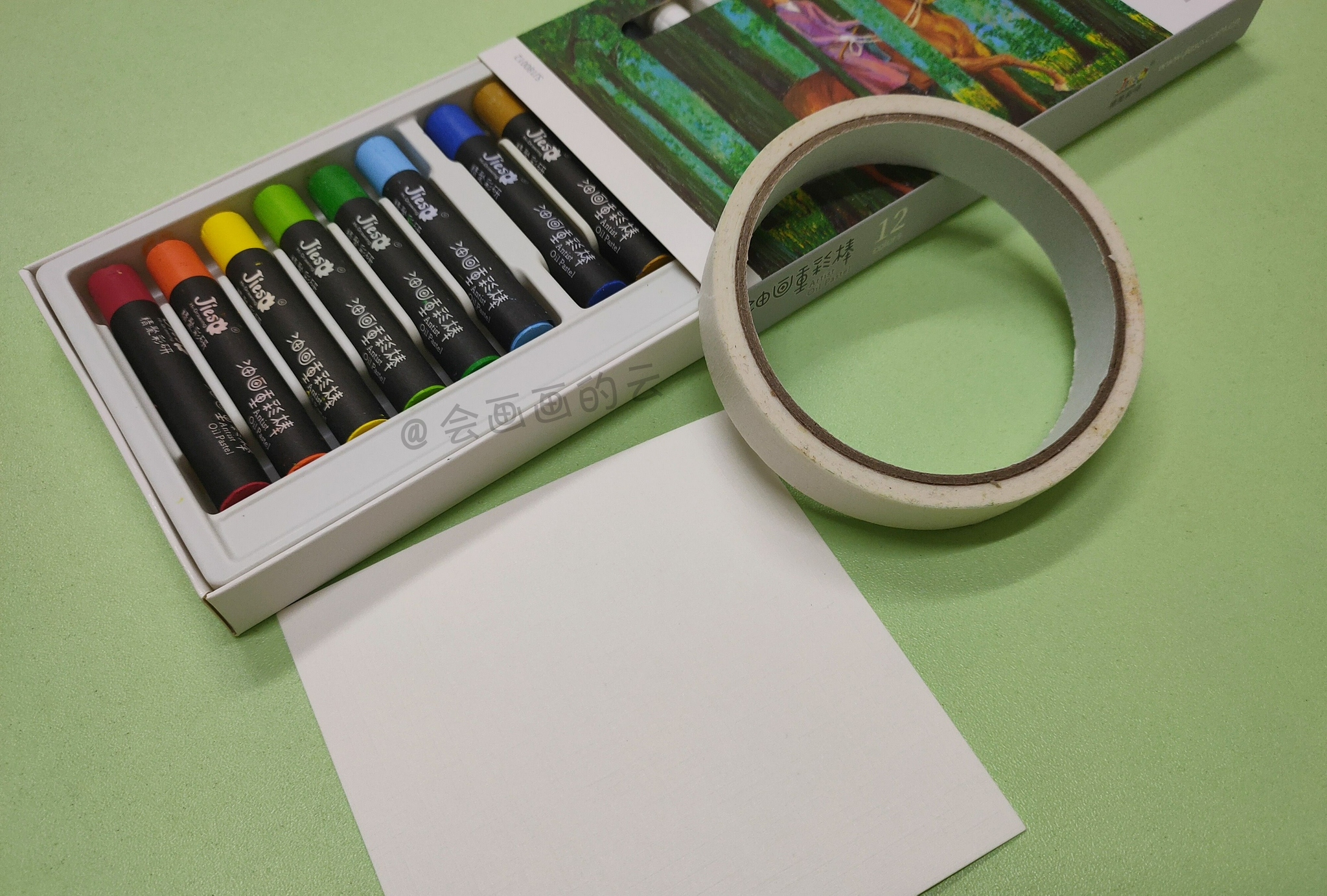 001、先准备好要用的工具,油画棒纸、美纹胶带、油画棒;