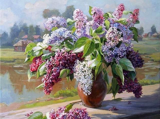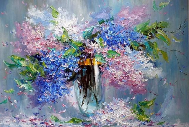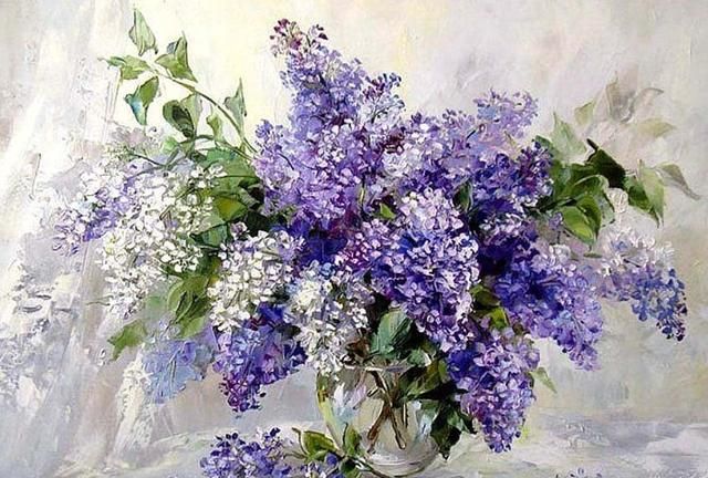 丁香花的花朵很小,画的时候需要先整体概括出花团的色块,然后由深到浅地分出体块明暗,再用小笔逐渐提点出花朵的层次感。