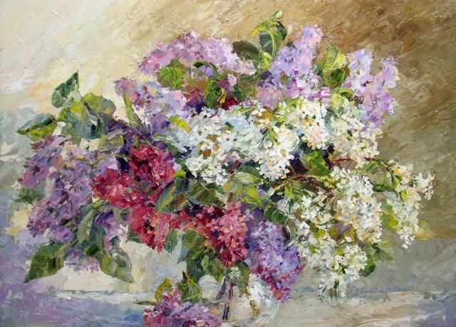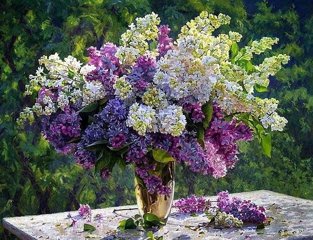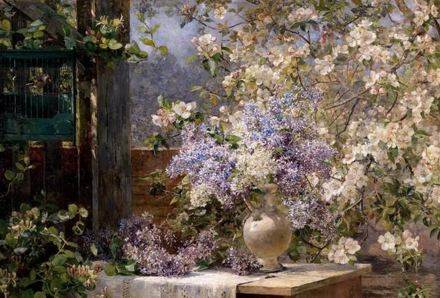 作品中采用柔和的室内自然光,背景墙面、花朵、叶子、桌面的用色都很稳重。锦簇的花团、稳重的颜色,使得画面很有质感、量感。