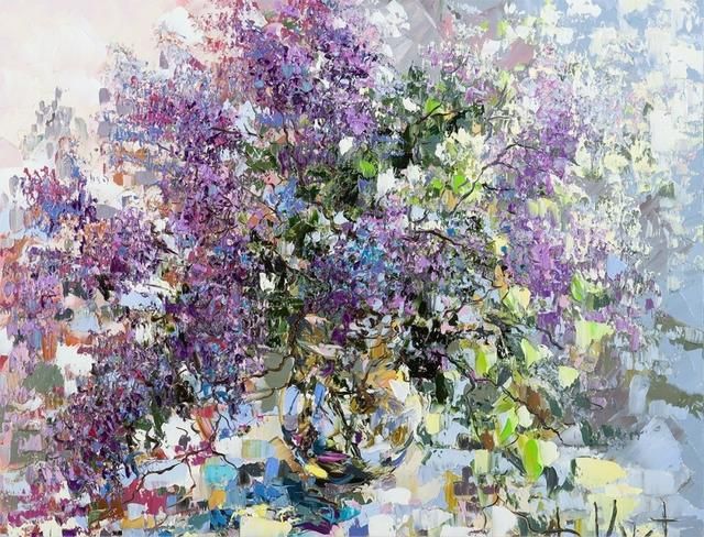 紫色的明度很低,成了画面中颜色最深的部分。紫色的色相也很明显,在画面中显得比较突出,与其它颜色形成鲜明的对比。绿色的枝叶舒展着,在阳光下显得朝气蓬勃。