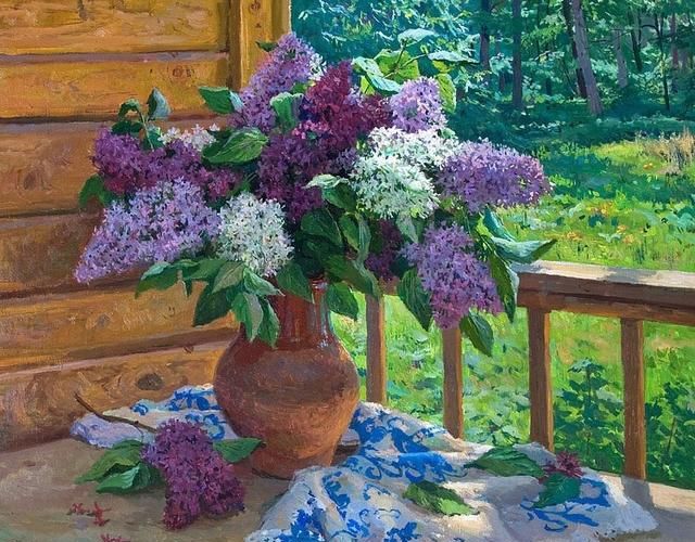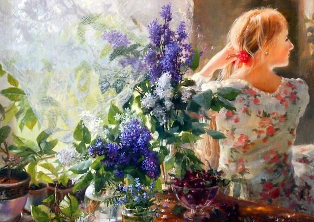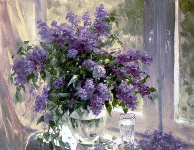 紫色的丁香花,在透光的玻璃窗边显得尤其素雅。湿薄的颜色具有很好的通透感,使得画面拥有强烈的光感。干湿结合的画法,使得画面生动有趣,富有灵性。