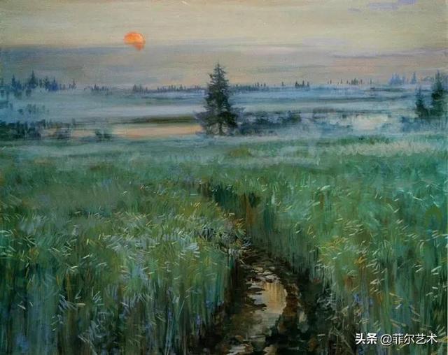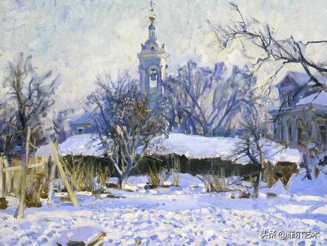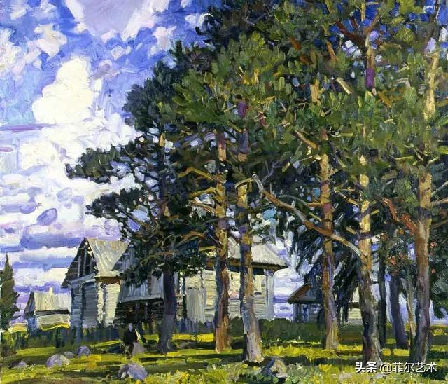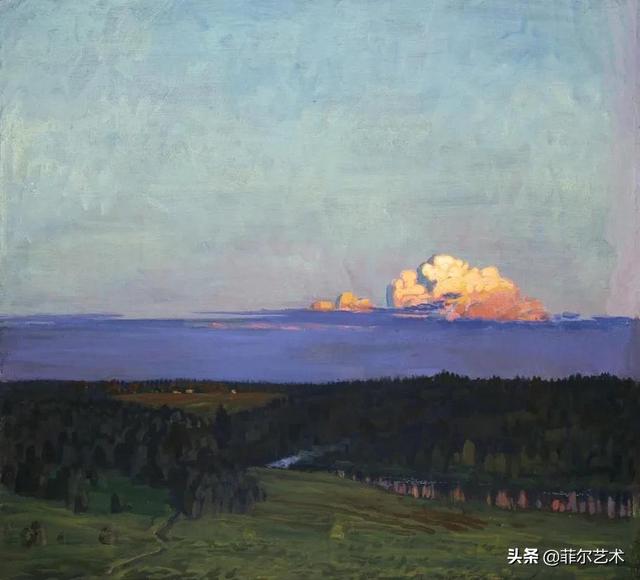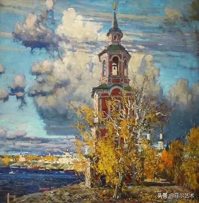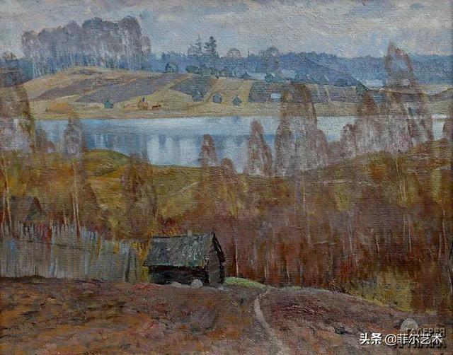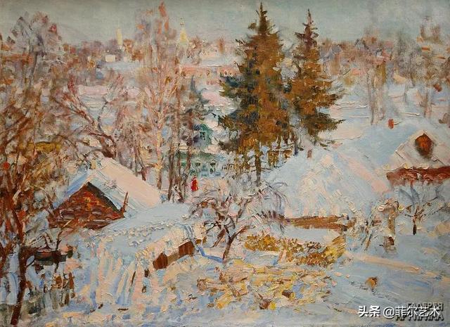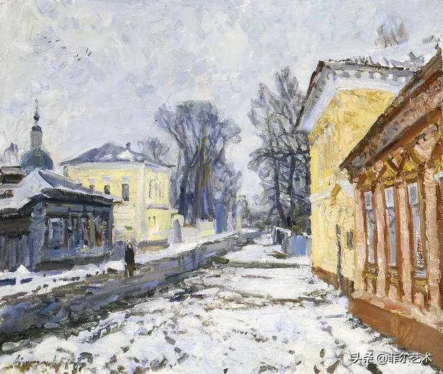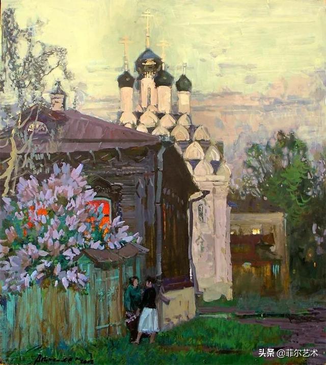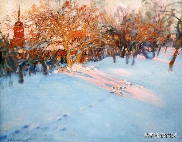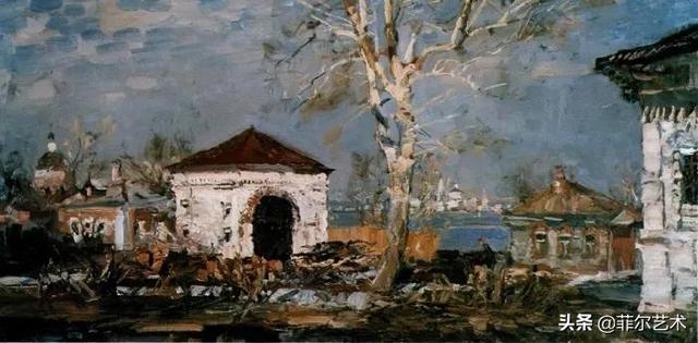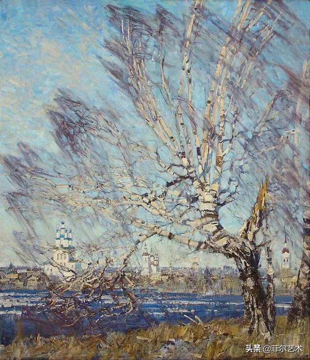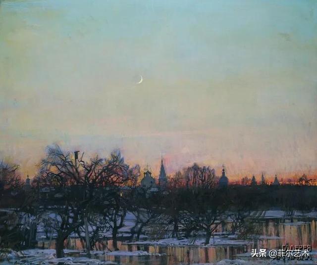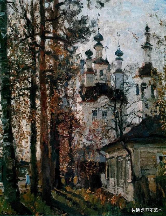 大气的自然世界在阿巴库莫夫的艺术中是至高无上的——在他描绘的宁静、温暖的夜晚中,树林装饰着夕阳的最后一缕光芒,闪闪发光的雪,被雨水洗浴净化的绿色世界,透过春天的青翠看到的修道院白色墙壁……所有这些都是刻意地充满了微妙的,颤抖的诗意。