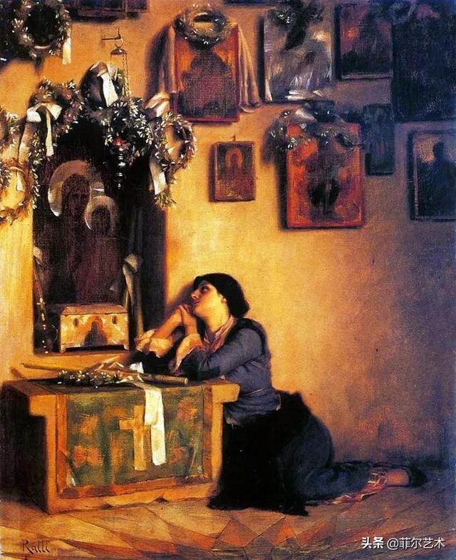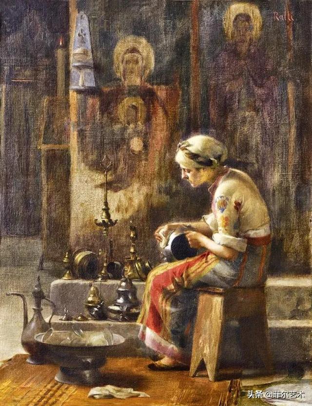 拉利(Ralli)在北非和中东广泛旅行,在埃及开罗定居了一段时间。在这里,他发现了许多东方主义绘画中浪漫的神秘主义。他的其他流派画作通常是对希腊故乡的生活和习俗的怀旧回忆,对他的描绘带有微妙而动人的敬意。他的作品精致,注重细节,着重服饰和面部表情。他绘画中的各种光源,例如光线,蜡烛或壁炉中的炽热余烬,都以柔和的色彩呈现出来。
