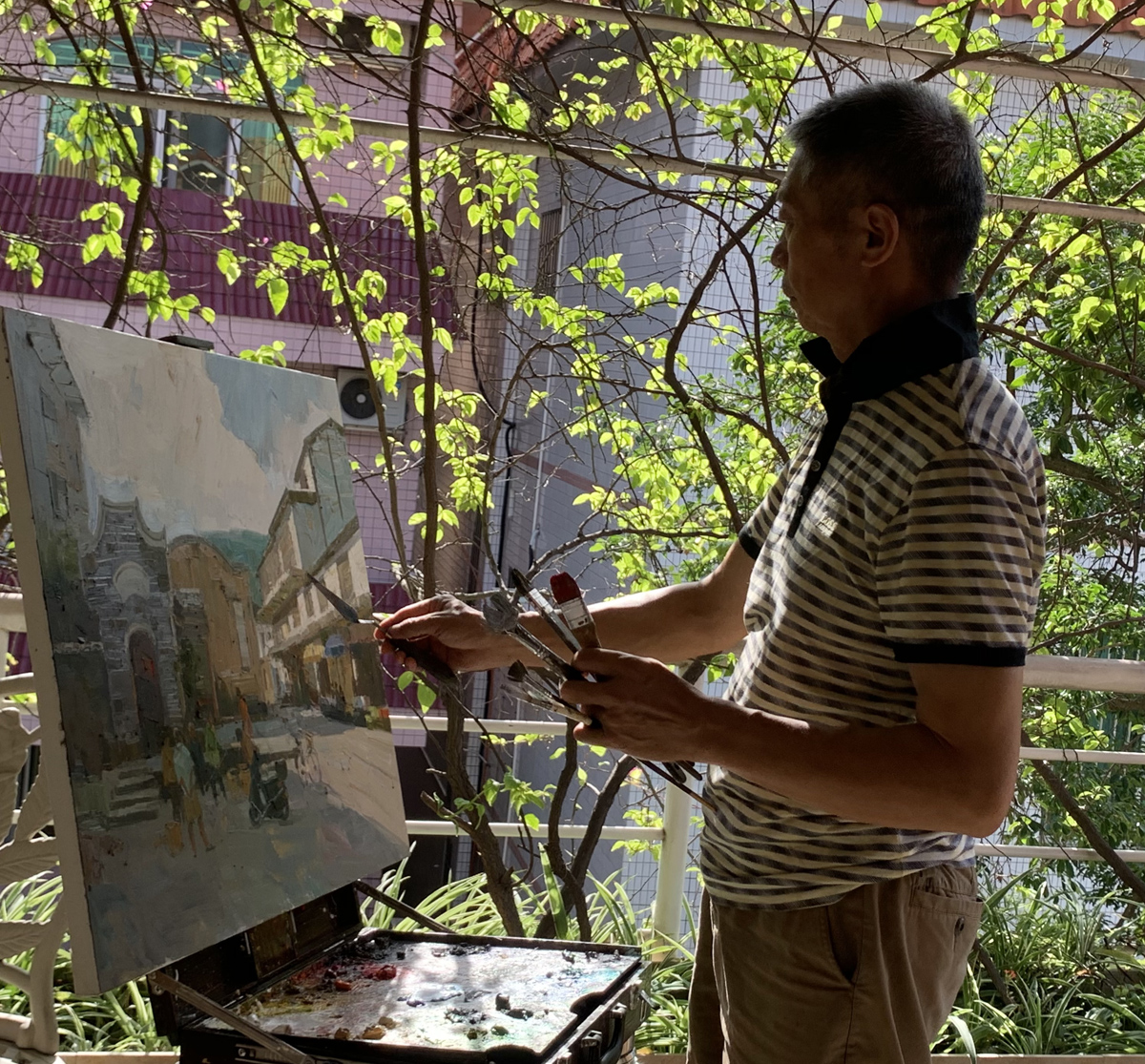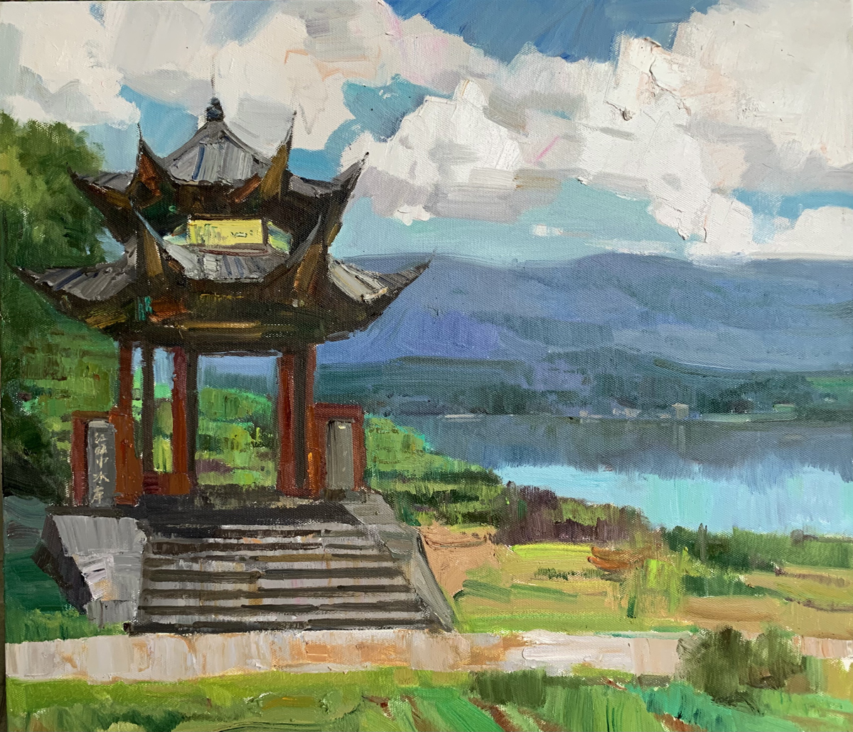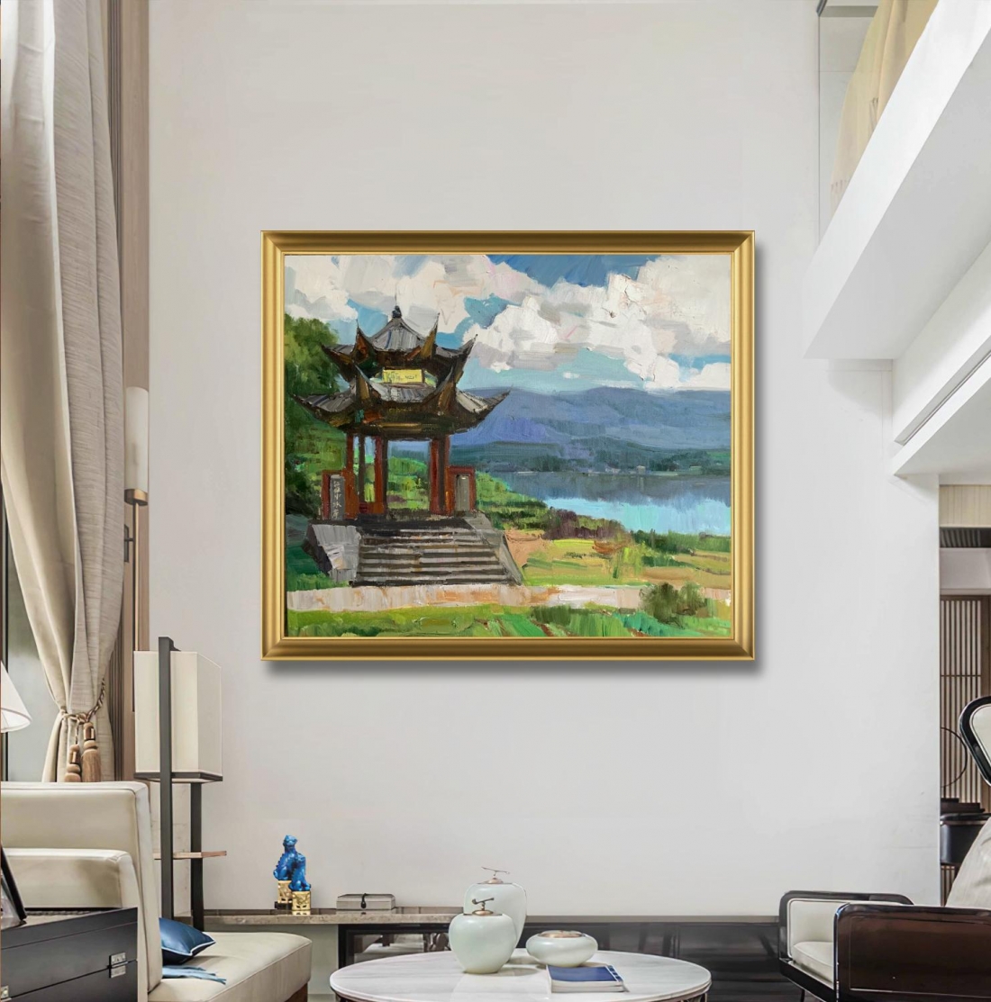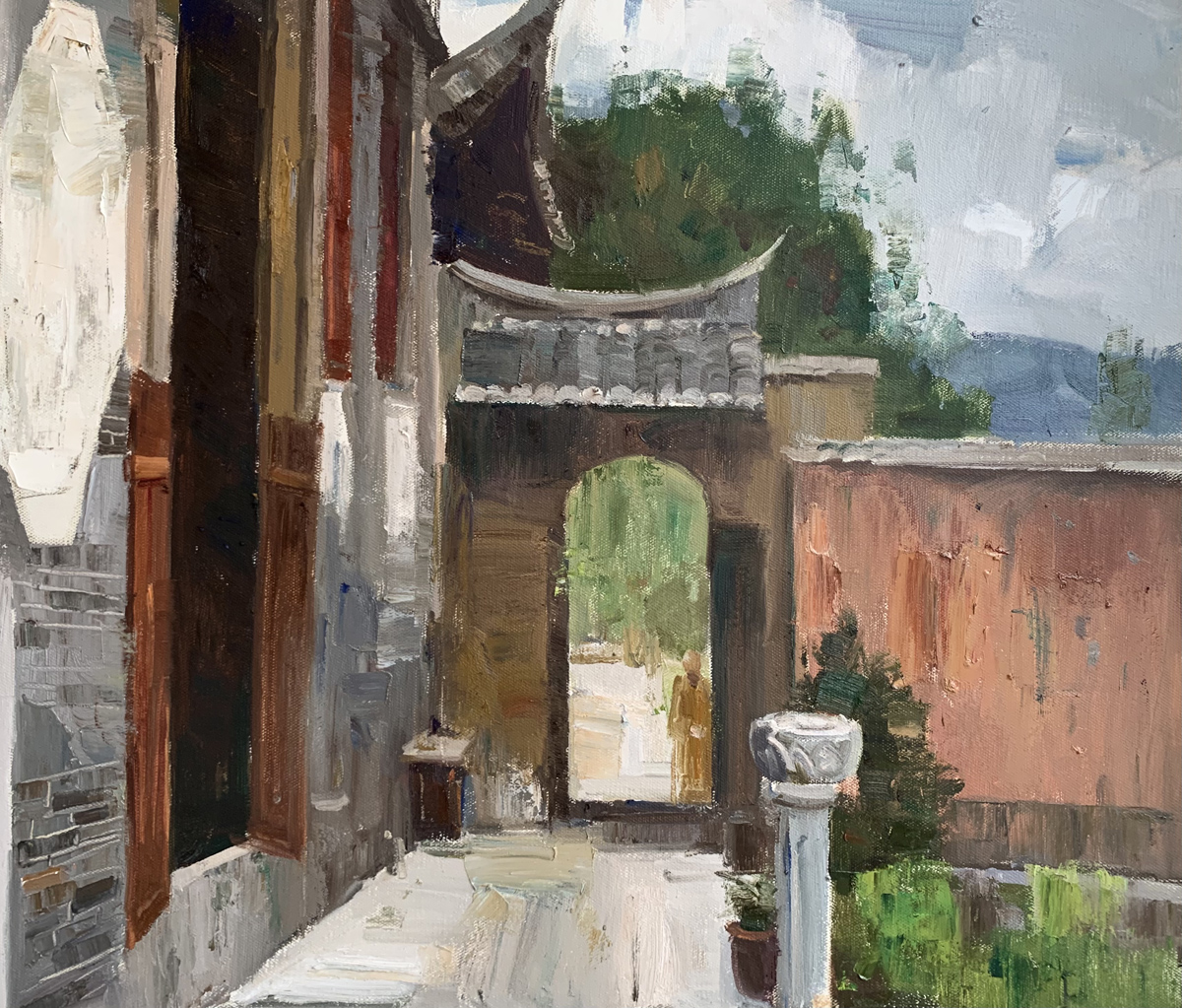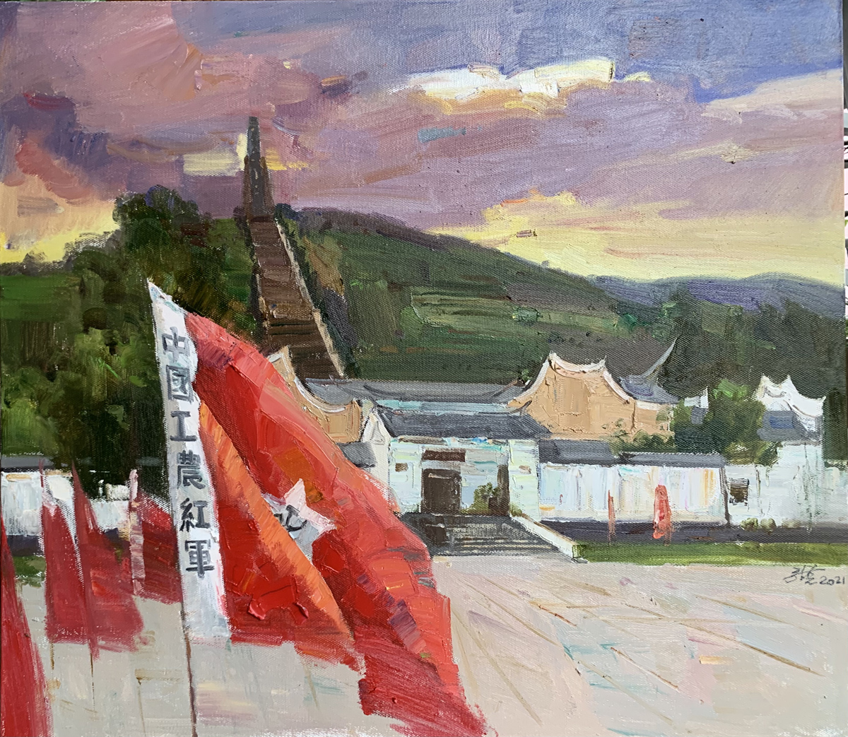倘若一个人在自己的精神世界里,能够始终恬淡愉悦,一定是因为他的心里有一盏明灯。纵使外界肃杀晦暗,心中也始终草木繁盛,明亮如昼。让我们走进油画艺术家张克先生狮峰寺写生的画作,欣赏一幅幅画作画幅清爽,柔和美妙,犹如一个简静的空间,用明亮的色彩记录了过往的岁月,纵是土墙青瓦已是斑斑驳驳、雕梁画栋也显满目疮痍,亦可看到寺庙建筑的雄伟壮丽、古朴典雅的风姿;草木盛绽、山清水秀、天蓝草绿的明亮;革命圣地、红旗招展的红色情怀。