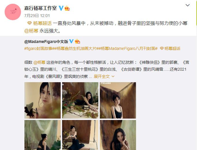 7月29日,杨拍摄的8月封面大片被曝光,这一次杨幂拍摄的主题是“盎然生机油画大盘”,随后,嘉行杨幂工作室转发杨幂拍摄的8月刊封面,还表示“杨幂一直身处风暴中,从未被撼动,融进骨子里的坚强与努力使的小幂永远强大”,很快杨幂的8月刊封面就在网上走红了,引起了网友们的关注和热议。